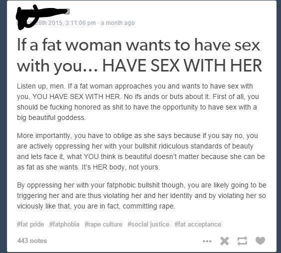 Perhaps a more pertinent comparison would be to say that it's nonsensical to write off an ideology which is, at it's core, about establishing equality between the sexes because of the radical few who take it too far in the other direction, just as it is nonsensical to say that all men are rapists because some men rape. Everyone likes to criticize/try to discredit feminism by pointing to some of the more ridiculous sh*t people post on Tumblr, when most of the things people use to discredit it are works of fiction/parodies of feminism by the same people who are trying to discredit it to begin with. That thing about having sex with fat women that CaptainForehead posted is a great example of this. If you think that is anything more than a parody/satire, you need to wake up because you're obviously just looking for reasons to hate feminism if you take that sort of stuff seriously.