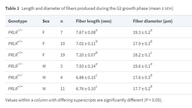This is a table from the mouse study linked above showing that only full inactivation of the PRLR enlarged hair shafts. Also from this you can see that silencing the PRLR enlarges male follicles more than female. This aligns with the hair counts from the macaque study that found males responded better than females to the PRLR antibody, and studies showing that catagen genes are downregulated by prolactin in human female frontotemporal hair, and blocking prolactin causes apoptosis in those hairs while adding prolactin elongates them. This is the opposite of what has been observed in human male scalp follicles. This might partially explain the different patterns in female and male pattern hair loss. PRLR antagonism will likely only work on the vertex in women while working everywhere in men.
