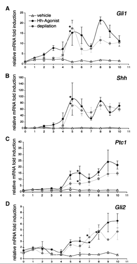@pegasus2 - I don't disagree with your comments. My point in posting about them, was that they (Clob & Hal) do act as Smo agonists, they do displace BODIPY-Cyclopamine. Certainly not to the degree that SAG does, but, about 20-25%. That may be enough with the help of minoxidil, needling, tretinoin (to mitigate the skin atrophy from glucocorticoids). The combo may activate Hh just enough, over a period of time, to initiate hair growth. The only citation I could find using the combo triamcinolone acetonide after micro needling was in a patient with Alopecia areata, and, it did initiate regrowth of hair after 2 sessions. TA has been shown to bind to Smo & enhance Hh signaling. Even though the "small molecule" Class glucocorticoids have been shown to activate Hh, I don't think it is enough by themselves to trigger hair growth. What they do have is a history of use in humans & a safety profile. The combo (Hal / minoxidil / Needling / Tretinoin) might be enough to over-come the remaining inhibitors at play. Taking into consideration of course, the feedback loop of Hh ... too much stimulation triggers shut-down. How much is too much? .. not enough data yet. Once a week session might be right ... once a month session might be right. I am starting this protocol currently @ once a week. I will update if there are positive / negative changes.