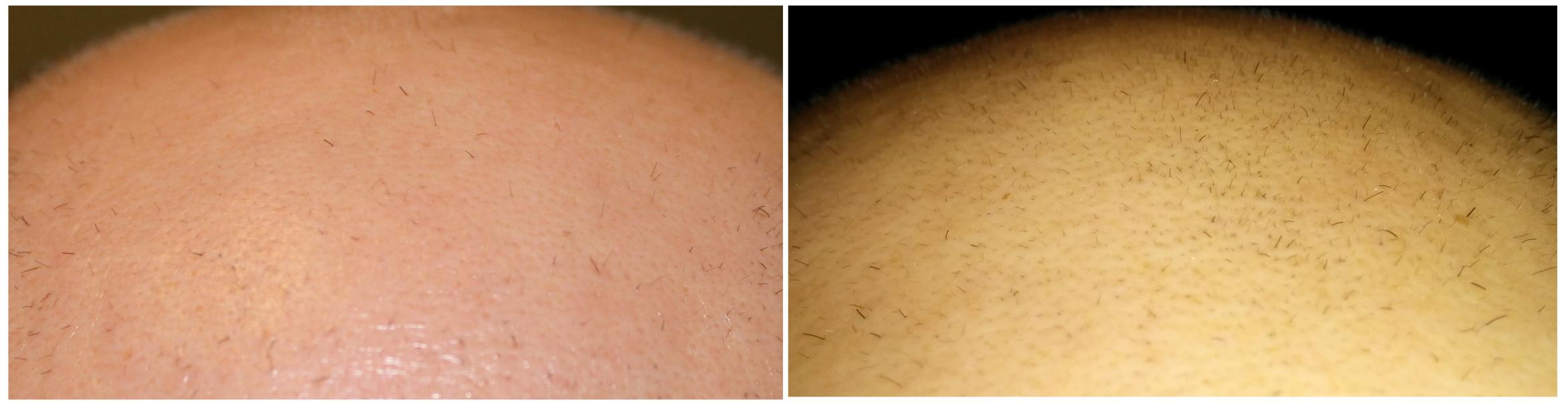 My progress in less than two months of dermarolling. I also started finasteride and minoxidil two weeks before I started rolling. I've shared the first pic before, but the second provides another view. The shots on the left are from 10/17 and on the right from 12/5. I think it's significant for this short amount of time, especially considering I had no luck a few years ago while on the big 3 for over a year. I only ever saw more vellus hairs back then.