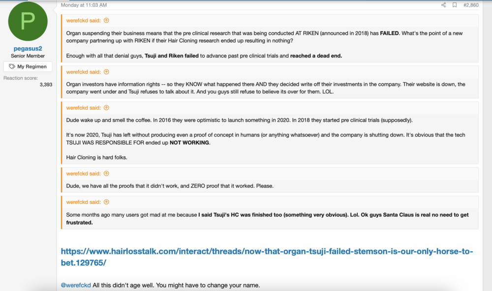 Sorry to say, but pegasus once again showed his biased point of view.NO, ACCORDING TO PEGASUS EVERYTHING WAS GOING RIGHT IN THE RESEARCH AND TSUJI WAS GOING TO SHOW US TODAY THE FIRST CLONED HAIR IN A HUMAN LOLOL