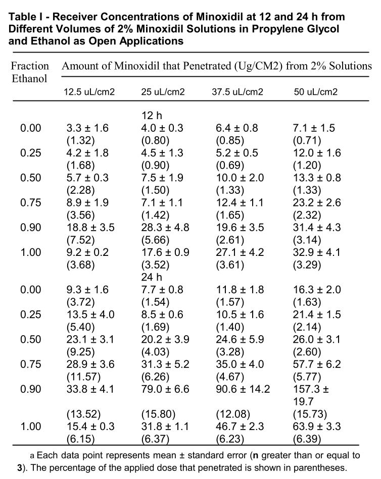 "...penetration of minoxidil peaked at the 90% ethanol solution for all application volumes by the 24 h..."