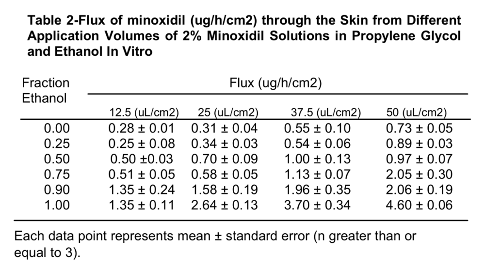On the following page "...penetration of minoxidil through the skin was faster with neat [100%] ethanol, but...this was true only for the first 3h, the slower flux from 90% ethanol solutions over a more extended period (3-8 h) eventually lead to more total minoxidil penetrating through the skin."