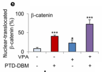 Here's a graph from the Lee study showing nuclear (i.e. activated) beta-catenin in mice treated with either nothing, PTD-DBM, VPA, or VPA + PTD-DBM respectively.
