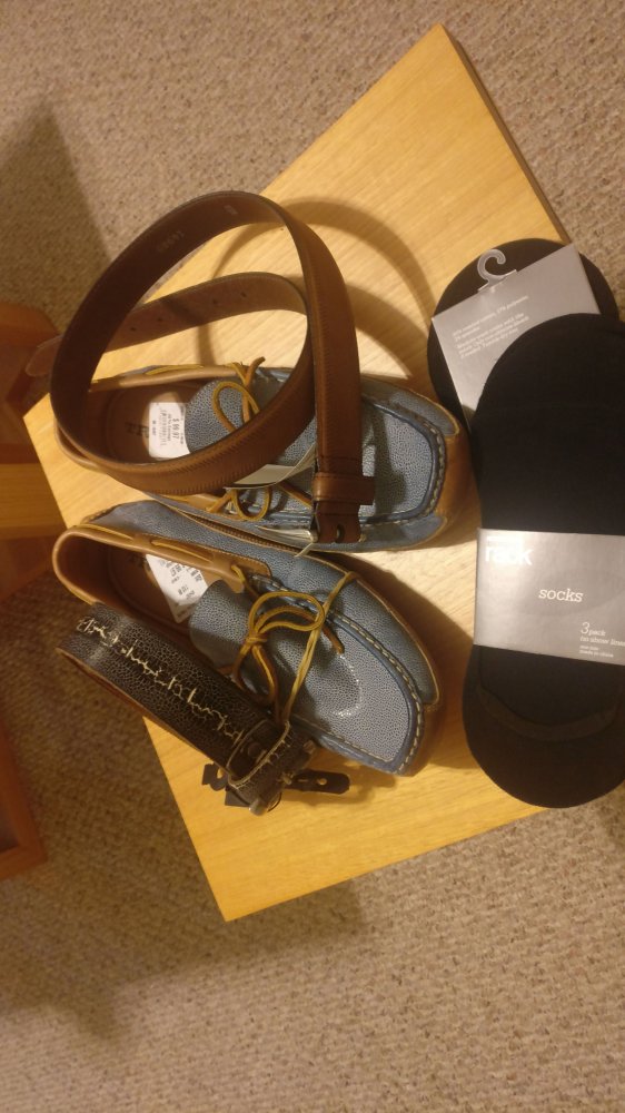 I have low-cut socks (for hygiene purposes, in black) to go with the blue and brown boat shoes. A belt has to go with a matching pair of shoes (as is well known, it's why belts and shoes are sold together), and when a pair of shoes has two colours the belt can be either colour (apparently). In the store I bought a light brown Allen Edmonds belt, but in a separate store afterwards I found a blue belt from Marco Valentino. Marco Valentina makes some of the best belts for men, so I bought it.