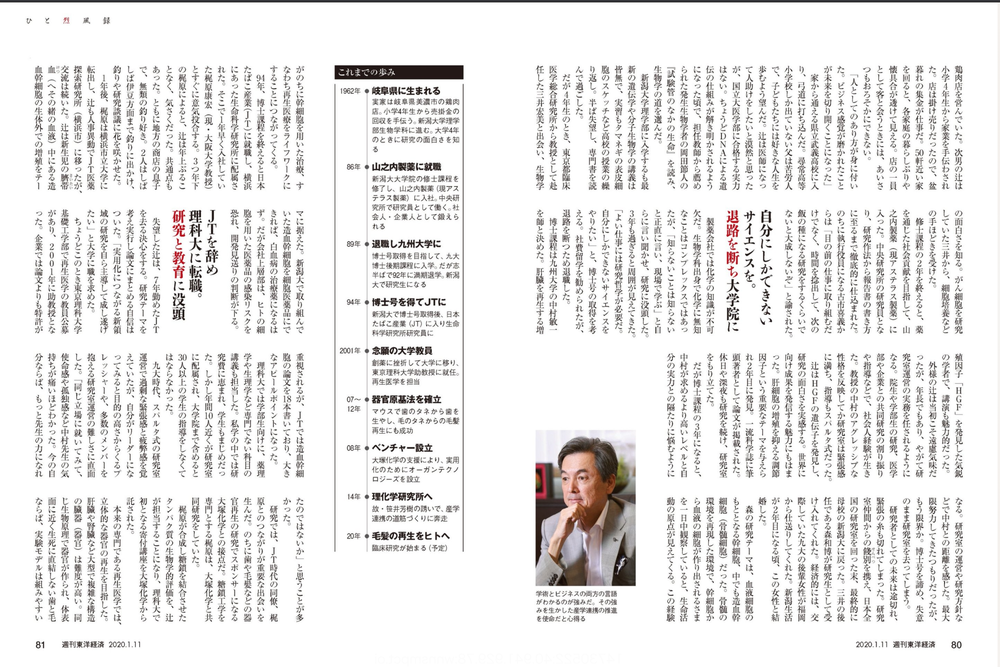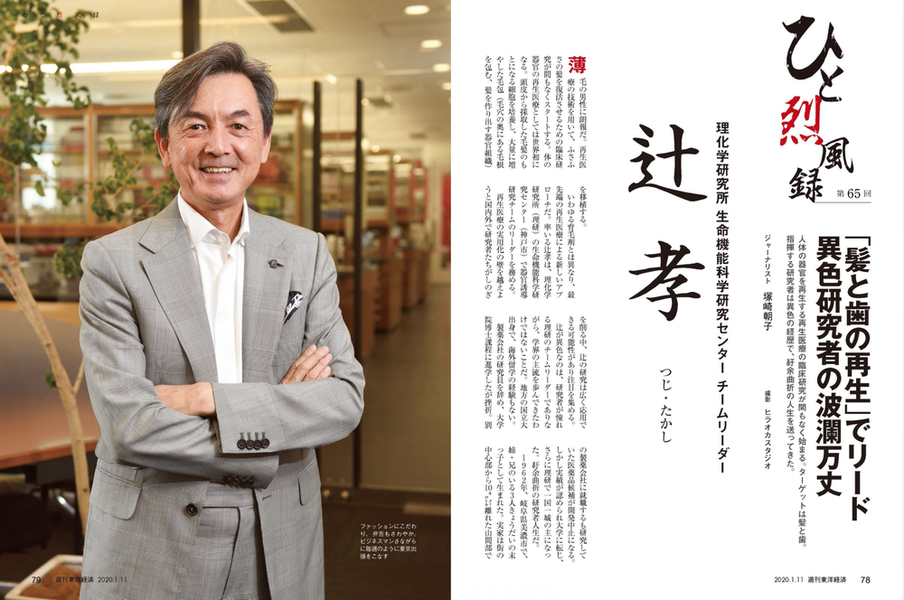 I wondered if this was the case. If the hematopoietic stem cells, which were being developed at Niigata University, could be turned into a drug for treating autologous blood disorders, it would certainly be a cure for autologous blood disorders. However, the company's top management decided not to develop the drug, fearing that it might be contagious if it used human cells. Descent. is the row that would later lead to making stem cell-based therapy, or regenerative medicine, a life's work. After finishing his doctoral studies in 1973, he joined Japan Tobacco Inc. and was assigned to the Life Science Institute in Yokohama, Japan. Then, he was hired a year earlier, and he immediately hit it off with Yasuhiro Fudwara (currently a professor at Osaka University), who was three years younger than him. He immediately got along with Yasuhiro Fudwara (currently a professor at Osaka University), who had joined the company a year earlier and was three years younger than him. According to Toshihara, Tsuji was friendly, without being "too old for him". They had one thing in common, too: they were both sons of local shopkeepers and had a passion for fishing. Both were sons of local shopkeepers and had an unparalleled love of fishing. After a year of lively discussions about research and research, Kajiwara was transferred to Yokohama City University and Tsuji was transferred to JT Pharmaceuticals, Inc. He moved to the Discovery Research Institute in Yokohama, Japan, but the Bunryu continued. Tsuji's research focuses on the proliferation of hematopoietic stem cells in the umbilical cord blood of newborn babies in vitro1. At JT, he wrote a paper on hematopoietic stem cells, which became a major beer-boynt. At the University of Science, he taught a course on non-specialized subjects such as pharmacology, chemistry and physiology before he was an undergraduate. The university was blessed with a high level of funding among private schools and its students were serious. However, I was assigned to a laboratory with 10 students per year. I was assigned to a laboratory, which had an annual stipend of ten students, and I had to supervise more than a dozen students, including those in the graduate school. When I was a student at Kyushu University, I felt a sense of tension and a sense of alienation in the Spartan laboratory HeC, but I was the leader of The pressure from the height of purpose and the difficulty of managing a lab with many members when you become a I was confronted with the fact that I was in the same position as Dr. Nakamura. He said, "Having been in the same position, I can now fully understand how Dr. Nakamura felt about his feelings of unity and loneliness. I'm sure that I'll be able to help him more if I'm on my own now, and I'm sure that the relationship with Kajiwara, a colleague of mine from JT, will be very important. This was the beginning of a unique encounter with Otsuka Chemical. This was the point of contact with Otsuka Chemical, which later became a researcher in the regeneration of organs such as teeth and hair. Kajiwara, who specialized in glycoscience, was engaged in research together with Otsuka Chemical. Tsuji was put in charge of the biological evaluation of tambac proteins synthesized by Taxahara and linked with glycolysis, and he was assigned to work with Otsuka Chemical in the field of science and technology. Otsuka Chemical Co., Ltd. entrusted me with its first endowed lecture series at the University of Tokyo, and my original specialty, regenerative medicine, is the study of three-dimensional organs. The aim is to regenerate. The large and complex structures of the liver and other organs are created in accordance with the biological principle, and are covered all over the body surface. If "teeth and hairs are not directly linked to life and death," it would be easier to build an experimental model, so Tsuji quits JT and moves to the University of Science. After immersing himself in research and education, Tsuji decides to leave JT after seven years of service. He had the confidence to think about his research theme, implement it, and write a paper on it. He wanted to take the initiative in researching a new field that would lead to practical applications, and he asked the university to fight for him. At that time, he was appointed as a faculty member of regenerative medicine at the Tokyo University of Science's School of Engineering and Technology and became an assistant professor in 2001. . In the whole industry, patents are more important than papers.