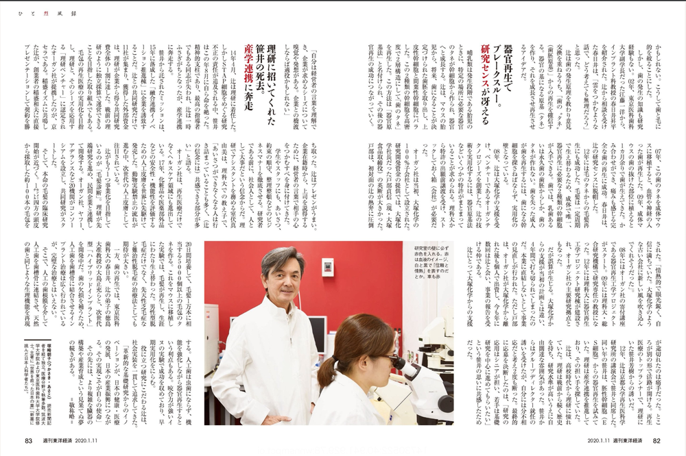 However, he had neither the knowledge nor the research experience on the development of teeth. He was introduced to Kasugai Shohei, a professor of dental implantology, by Kazuhiro Eto, the vice president of Tokyo Medical University. It was made. It's a cloud-grabbing story, and I don't think it's going to be possible," said Kasugai, who was consulted by Tsuji for nine years When these tooth seeds are transplanted into the adultus, the teeth with blood vessels and nerves regenerated for 8 years, the adult mouse's teeth If you plant it in the area where the tooth came out, you'll have a complete set of teeth that will grow back in just over a month, and you'll have a perfect fit and feel the pain. Successful regeneration. Kasugai was taken aback by Ichijitsuji's research sense, and in two years, he succeeded in the regeneration of hair from hair seeds. Because hair grows in a fixed cycle, only two types of stem cells necessary for official regeneration are available in adult organisms. In teeth, a seed for a tooth can only be made from the toothpaste of milkshakes or shui-ku'er. In order to regenerate a tooth in a toothless adult, the stem cells that can be used for tooth regeneration must be deepened, which is one of the barriers to practical use. In his early years, Tsuji founded Organ Technologies, a venture company with the support of Otsuka Chemical. In his early years, Tsuji founded a venture company, Organ Technologies, with the support of Otsuka Chemical. In order to put Tsuji's technology to practical use, a number of patents, including one for the organ germ method, must be consolidated The University of Science and others have filed a pre-patent petition for a patent, and the company needed a box to stock it. The University of Science and others received a pre-application proposal for the patent, and the company needed a box (company) to stock it "passionately and sharply dropped. The "V" is an endowed lecture given by the Organ Corporation in its year of residence, bringing new life to an old company like Otsuka Chemical. In 1996, he became a full-time research professor at the University of Science. In the following year, the University of Science constructed the Organics Regeneration Engineering Project, and it became a major research center of the Organ Corporation. In 2000, the Organ Regeneration Engineering Project was established at the University of Science, and it became a major research center of the Organ Corporation. However, a miscalculation occurred. The support from Otsuka Chemical differed from the original plan and was cut off after 4 years. The business was reviewed. However, Tobe continued to invest in the company privately even after it was separated from Otsuka Chemical, and he continues to meet with Tsuji several times a year. For Tsuji, who was a close friend of Otsuka Chemical's business reports, it was a form of support from Otsuka Chemical. However, a new opportunity opened up for him in a different way. Yoshiki Noui, a leader in regenerative medicine and a former researcher at Riken, invited him to join Kyoto University's Department of Regenerative Medicine for two years. The same age as Noui, who sat with him at a lecture at the institute, was a supervisory stem cell (E) student. Tsuji had been fascinated by RIKEN since his high school days. The history of Riken dates back to before World War II, and Sasai, who had a high standard of research and an air of respectability, told him that Riken was a good place to work. I was invited to be the Group Director, but I turned down the offer twice, thinking I was not suited to the position. In the end, I decided to apply for the position because I wanted senior researchers to be responsible for applications and young researchers to focus on basic research. He shared Sasai's desire for a "tooth", so Tsuji learned about the principle of the development of the South and exchanged ideas with him. He is convinced of the regeneration from the "Tanee" (the original organ of music). He made the base of the organ, the seed, and grew it and regenerated it into a 9-toto organ regeneration and play AK Me. When a clear mammal with a good research sense is in the embryonic stage of development, the seeds of organs needed for a specific location are stem It is made from cells and grows into an organism. Tsuji took a rakugo story from a mouse nodule, which was determined to become a tooth in the future, and created an epithelial stem The cells were paralleled into two types of stem cells and cryptogenic stem cells. These two types of stem cells were combined into a two-layered structure in a single high-degree trial, and the "Southern Seed" type S method was named "Instrumental Palace Method". This led to the success of the revitalization of the government, which was largely due to the wise decision of Otsuka Pharmaceutical Co. Initially, Organ was established as a wholly owned subsidiary of Otsuka Chemical, and Otsuka Chemical was the only company to provide research and development funds to the government. Sadanobu Tobe, then president of the company (now. Otsuka Tobe was overwhelmed by Tsuji's heatsuke in his first game against