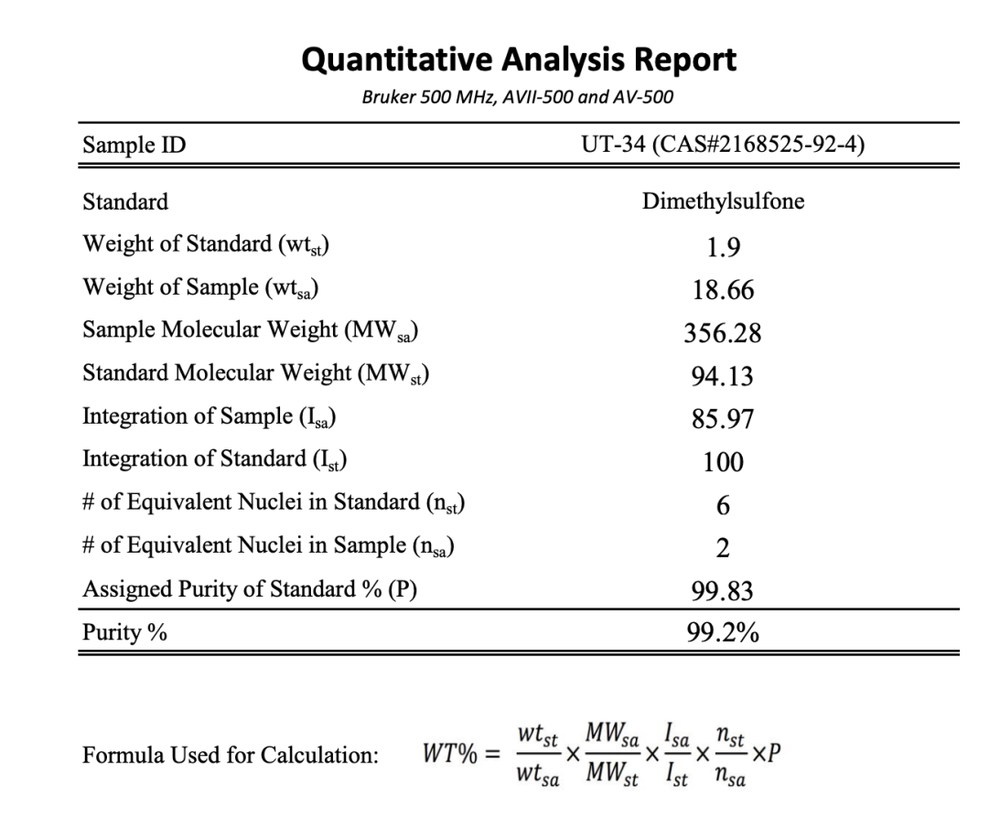 We've also purity tested UT-34 which came back at 99.2% purity. We got our UT-34 synthesised from Wuhan Pharm (China) and tested at NuMega in California, USA.