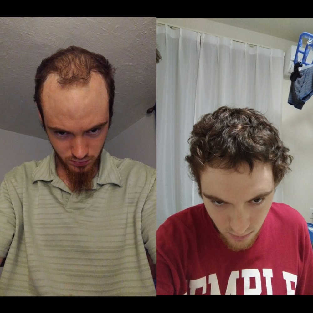 heres my avatar pic taken Dec.15th and on the left was May 22 before I started anything antiandrogenic. (the white stuff is miconazle i had on my scalp, I was hoping Swiss temples was gunnna save me)